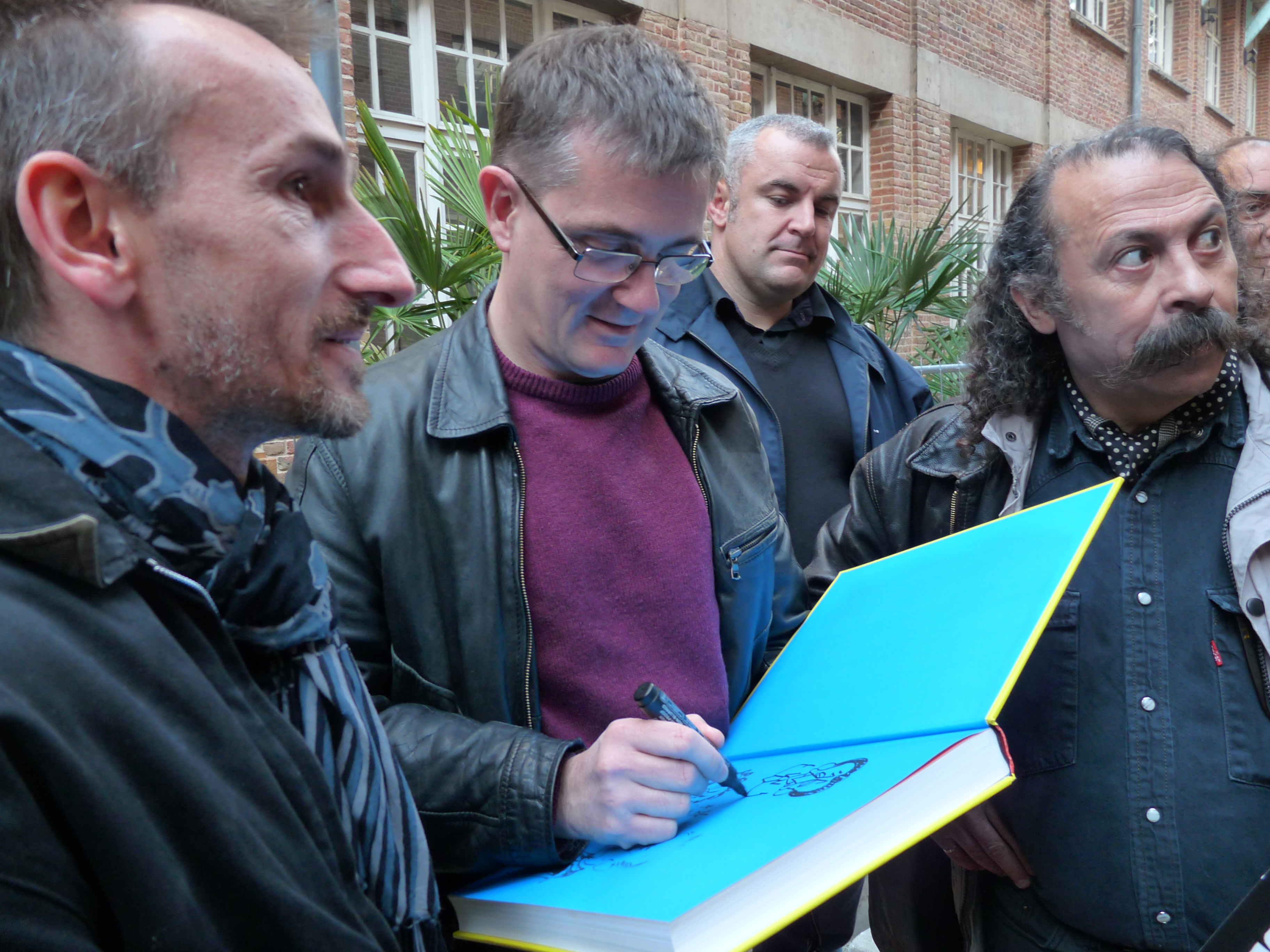Quelques lecteurs viennent se faire dédicacer le livre qui porte le nom de l’exposition, organisée par la bonne volonté de quelques étudiants (dont le jeune homme entre Wolinski et Charb). L’affaire des caricatures de Mohamet est au cœur des discussions. Déjà. Et Charb y répond avec volonté et insouciance.