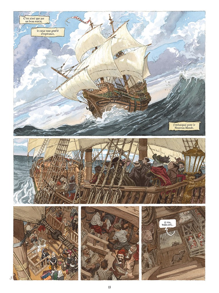 Pablos de Ségovie, héros littéraire du picaresque espagnol, n’avait jamais posé les pieds aux Amériques, son auteur du XVIIe siècle Franscico de Quevedo n’ayant jamais écrit de suite. Que nenni, le dessinateur de Blacksad et le scénariste de De cape et de crocs ressuscitent le fieffé Pablos dans un roman graphique qui en impose autant par le format de la BD que par son souffle épique.